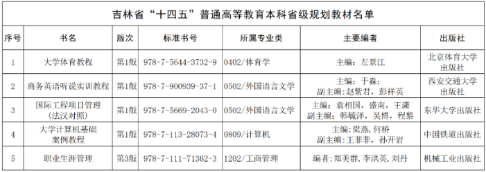 近日,吉林省教育厅公布了“十四五”普通高等教育本科省级规划教材评选结果,我校5部教材成功入选。此次获批的教材涵盖了计算机、英语、法语、工商管理等多个专业领域,充分彰显了学校在教材建设方面的卓越成果与深厚积淀。